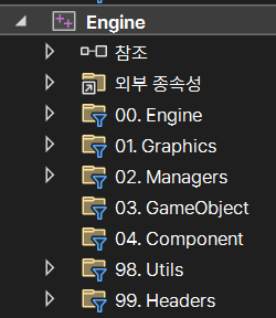 파일 구조는 위와 같이 맞춰주고 Enginge 프로젝트에서 설정을 맞춰준다.