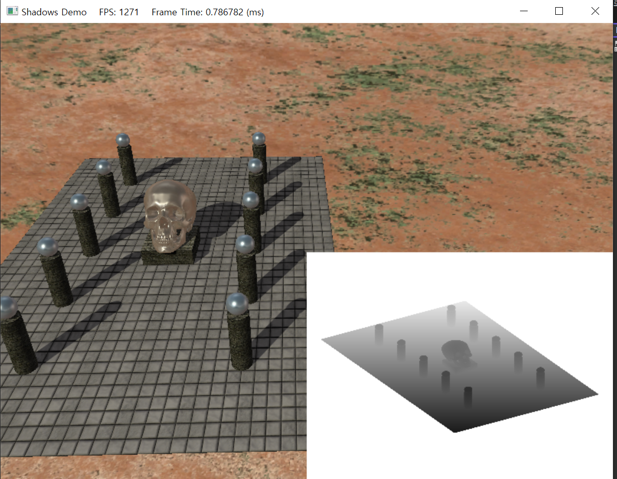 이때, 0, 1을 변환하는 과정에서 뷰, 투영, 보간을 하게 되면서 그 좌표의 Depth 값이 정해지는데 그값이 0.7이라면 기존에 작성된 0.5보다 크므로 기둥에 가려졌다고 판단할 수 있다. 이제 그림자를 칠해주면 된다.