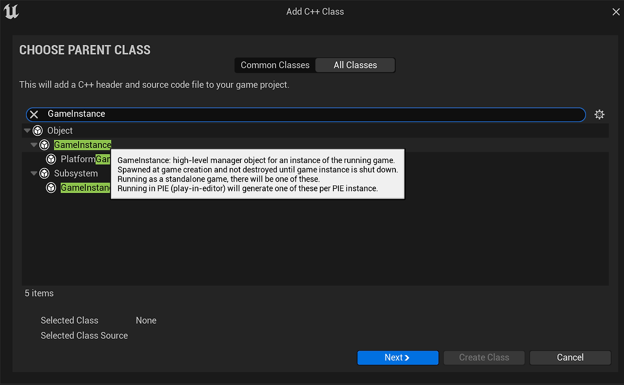 언리얼 엔진은 짜여진 틀 안에서 사용자가 추가로 제작하는 느낌이고 유니티는 처음부터 공사를 해나가야 하는 느낌이다. GameInstance를 상속받은 나만의 GameInstance를 생성해주겠다.
