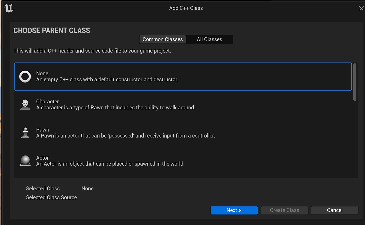 언리얼에서 클래스를 생성하는 건 다음과 같이 할 수 있다.