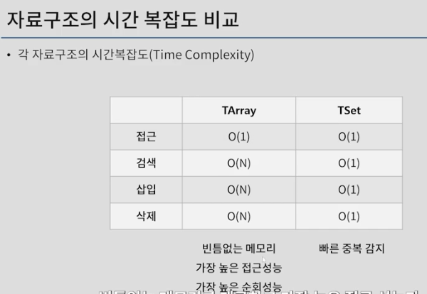 TSet은 중복되지 않는 요소로 구성된 집합을 만드는 용도소, C++ STL에서 Set과 유사하지만, 동작원리는 unordered_set과 비슷하다.