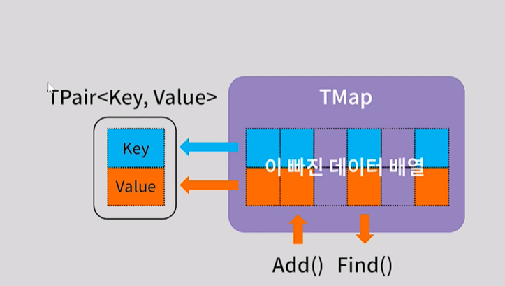 TMap = Key와 Value의 쌍으로 있다보니까, 중복을 허용하지 않고 그대로 가져오게 된다.