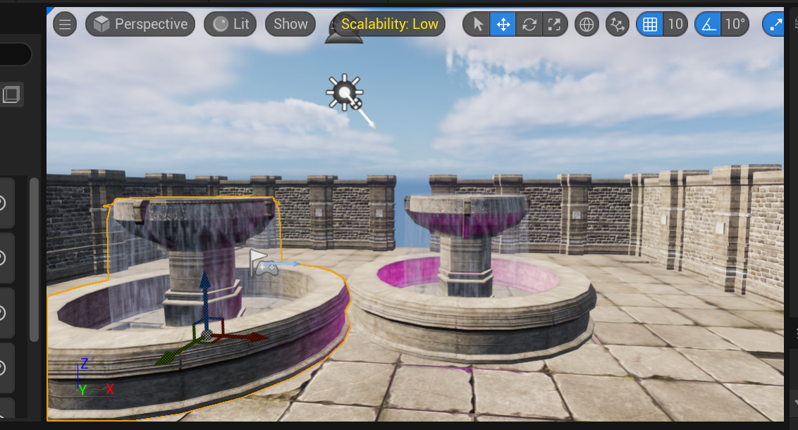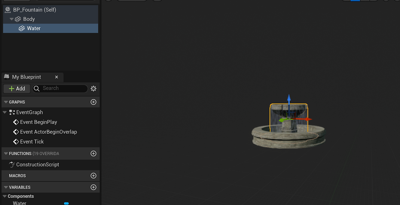 여기에 이제 Mesh를 분수대로 설정해주고 물도 추가해주면 이렇게 완성이 된다.