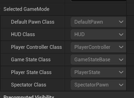 그리고 월드 세팅에서 방금 만든 GameMode를 넣어주면 아래처럼 기본 세팅으로 설정되어 있다.