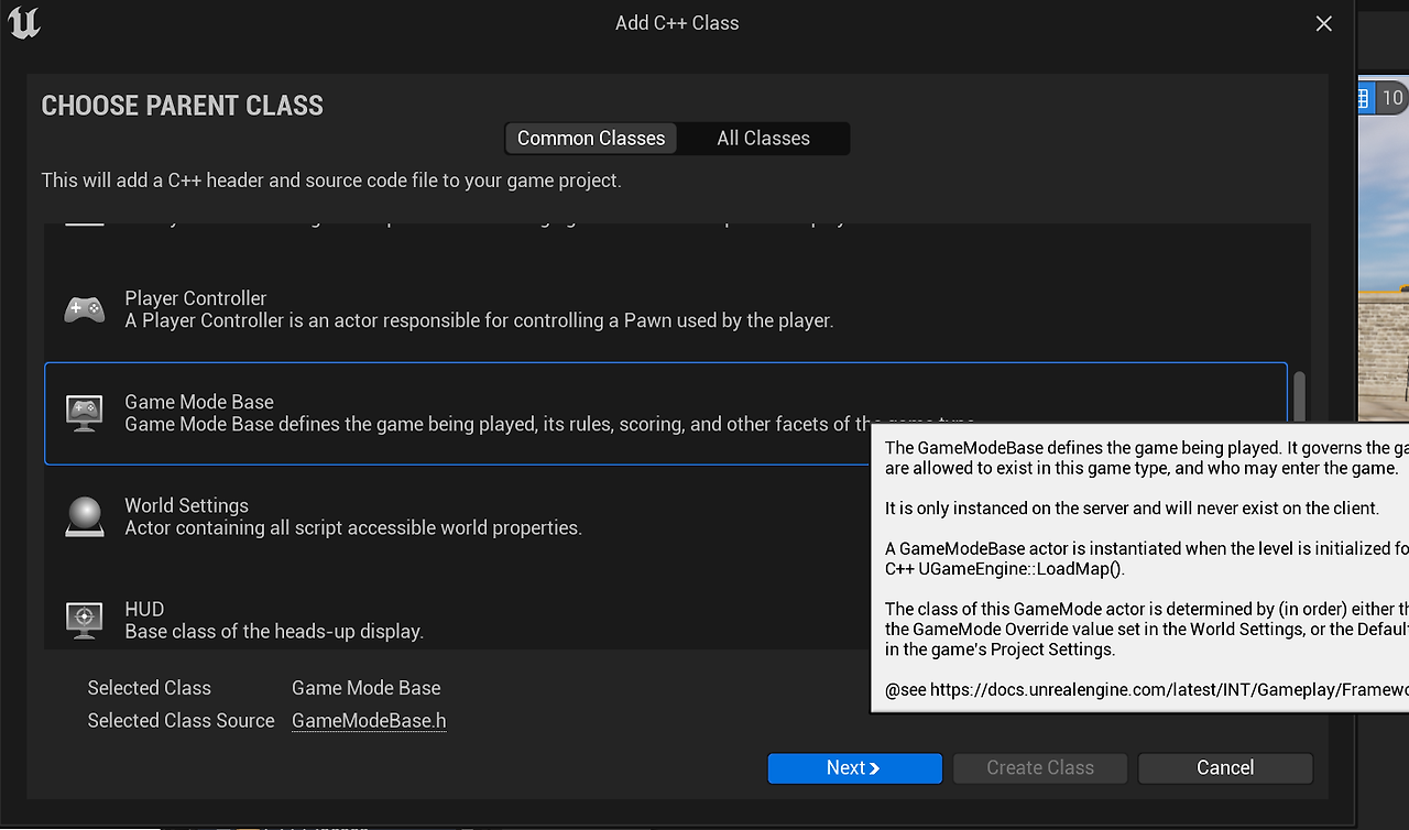 GameModeBase를 상속받으면 된다. 나머지 클래스들도 찾아서 생성해준다.