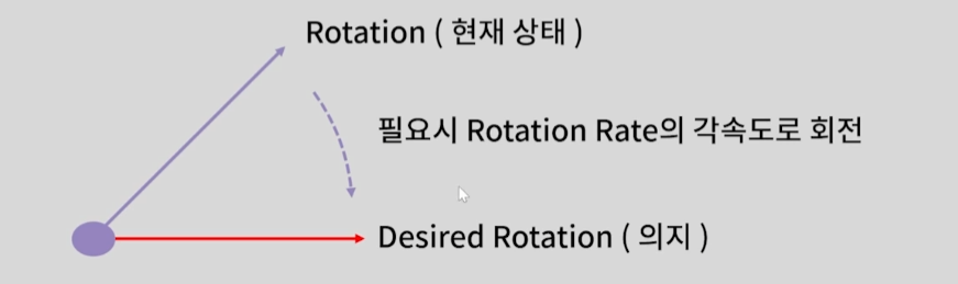 따라서 우리가 자연스러운 회전을 하려면 Rotataion에서 Desired Rotation으로 한번에 변하는 것이 아닌 각속도로 회전해야한다. 이는 설정을 통해 지정할 수 있다.