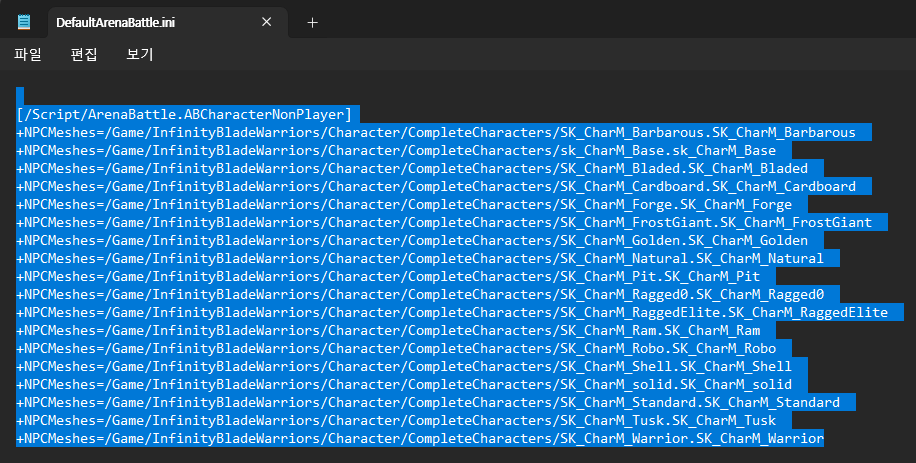ini 데이터를 활용해 텍스트 파일로 관리할 수 있다. 가령 mesh를 변경해주고 싶은데 데이터가 많다면 이렇게 지정해두고 이를 불러와서 이중 하나를 꺼내쓰면 된다.