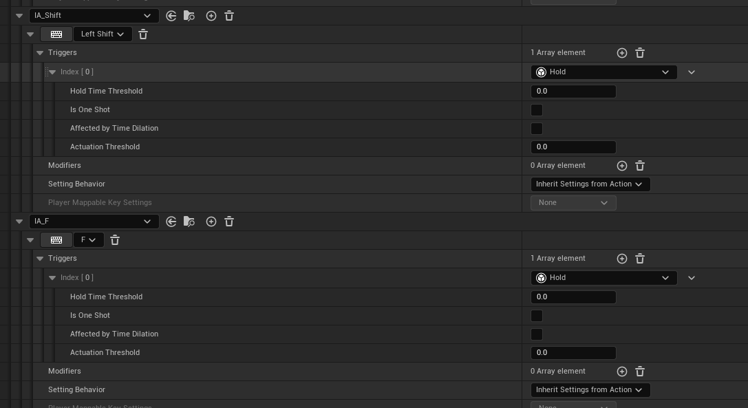 Trigger를 Hold로 설정한 다음, Hold가 시작 됐을 때, Shift를 누르고 있다는 것을 인지하고 End 됐을 때, Shift가 눌리지 않고 있다는 것을 체크한다.