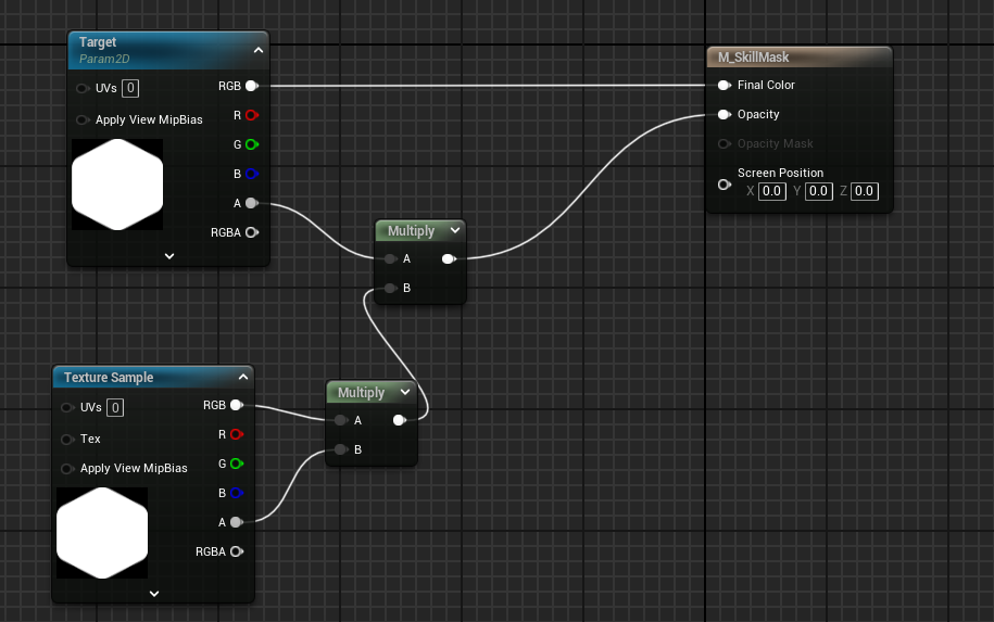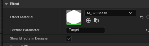 그리고 우리가 사용할 Target param에서 RBG 색을 Target 텍스처를 그대로 유지하며 투명도를 그전에 마스킹 해둔 것으로 변경하게 된다. 이렇게 함으로써 이런 네모난 스킬 아이콘에서 육각형을 얻을 수 있다.