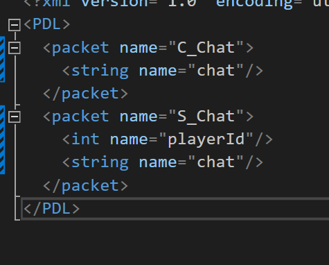 먼저 간단히 해보기 위해 패킷은 클라이언트 채팅 서버 채팅 두개로만 진행하기에 PDL 파일을 이렇게 수정한다.