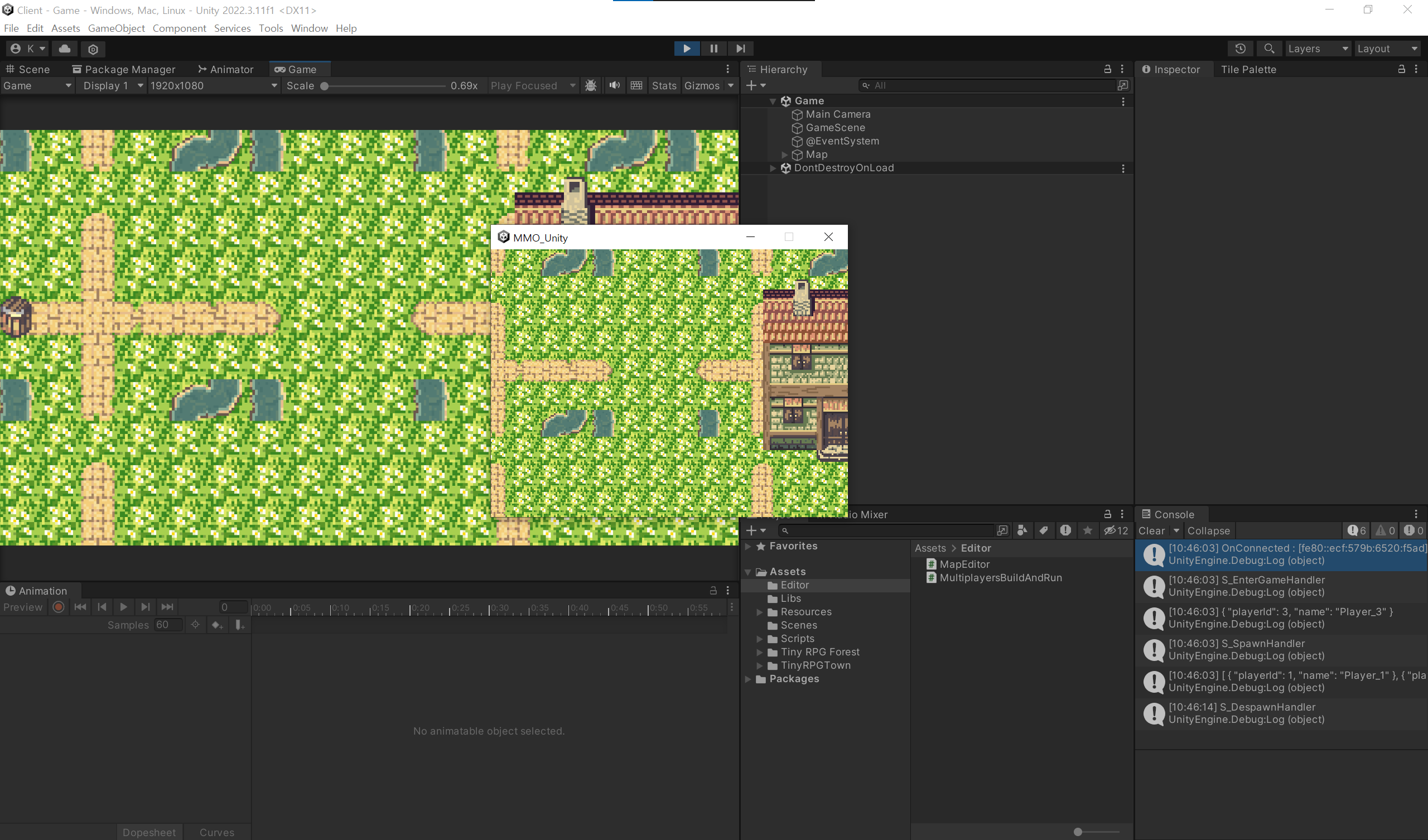 위에서 만든 멀티플레이 환경 구성에서 실행한 상태이다. 이제 유니티에서 실행을 한 화면을 보자.