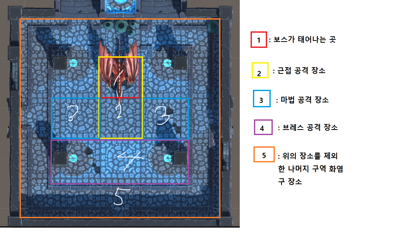 나는 현재 드래곤이 고정형 보스(위치가 변하지 않는 형태)이기에 자신한테 가장 데미지를 많이 입힌 플레이어(위협적인 플레이어)를 선정해 그 플레이어의 위치에 따른 다양한 공격을 하려고한다.